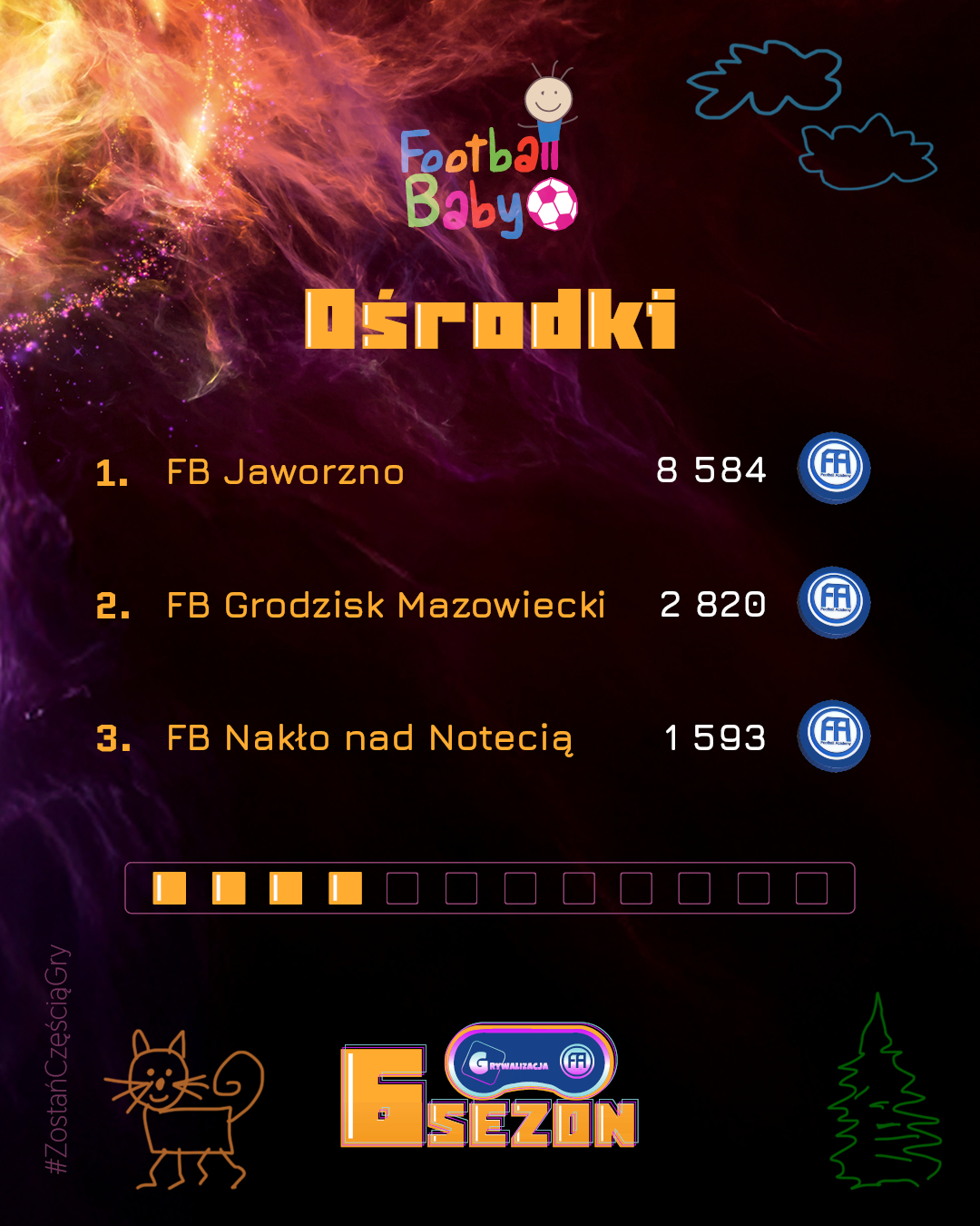 Wygrywanie w Football Baby to coś więcej niż wynik – to radość, uśmiech i satysfakcja z każdego treningu. Każdy miesiąc przynosi nowych bohaterów, którzy trafiają do naszej „Hall of Fame” i pokazują, że systematyczność oraz entuzjazm mogą przerodzić się w piękną sportową przygodę. Gratulujemy wszystkim, którzy znaleźli się w TOP 3! Poniżej prezentujemy grafikę z najlepszymi zawodnikami, trenerami i oddziałami minionego miesiąca.