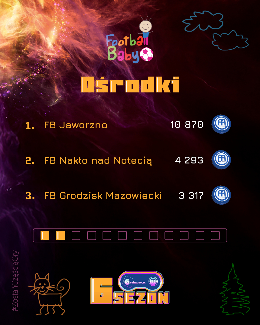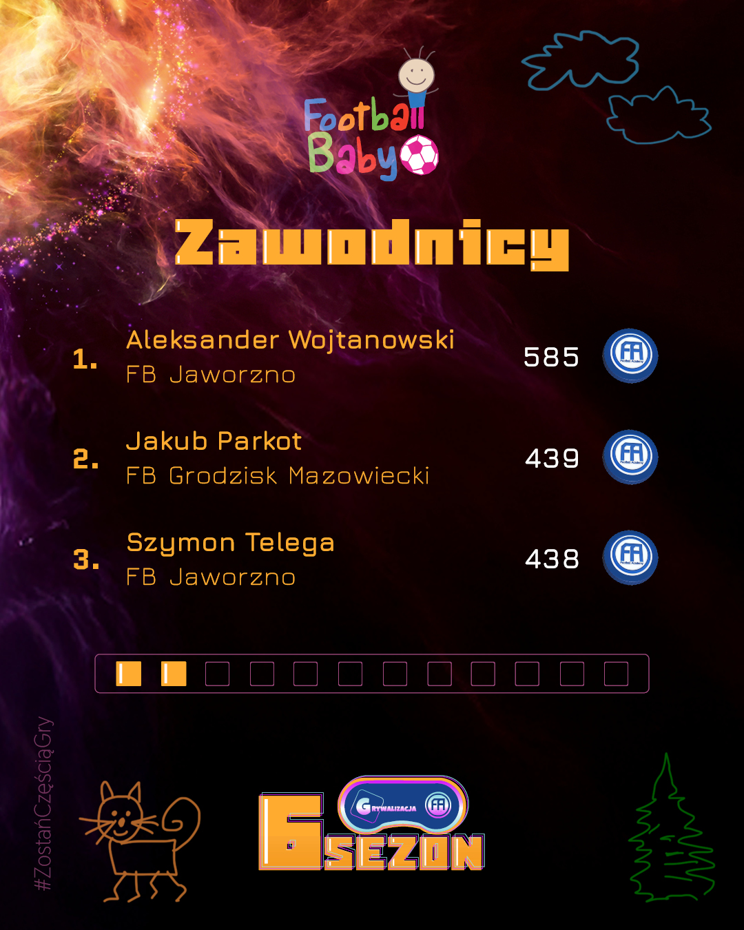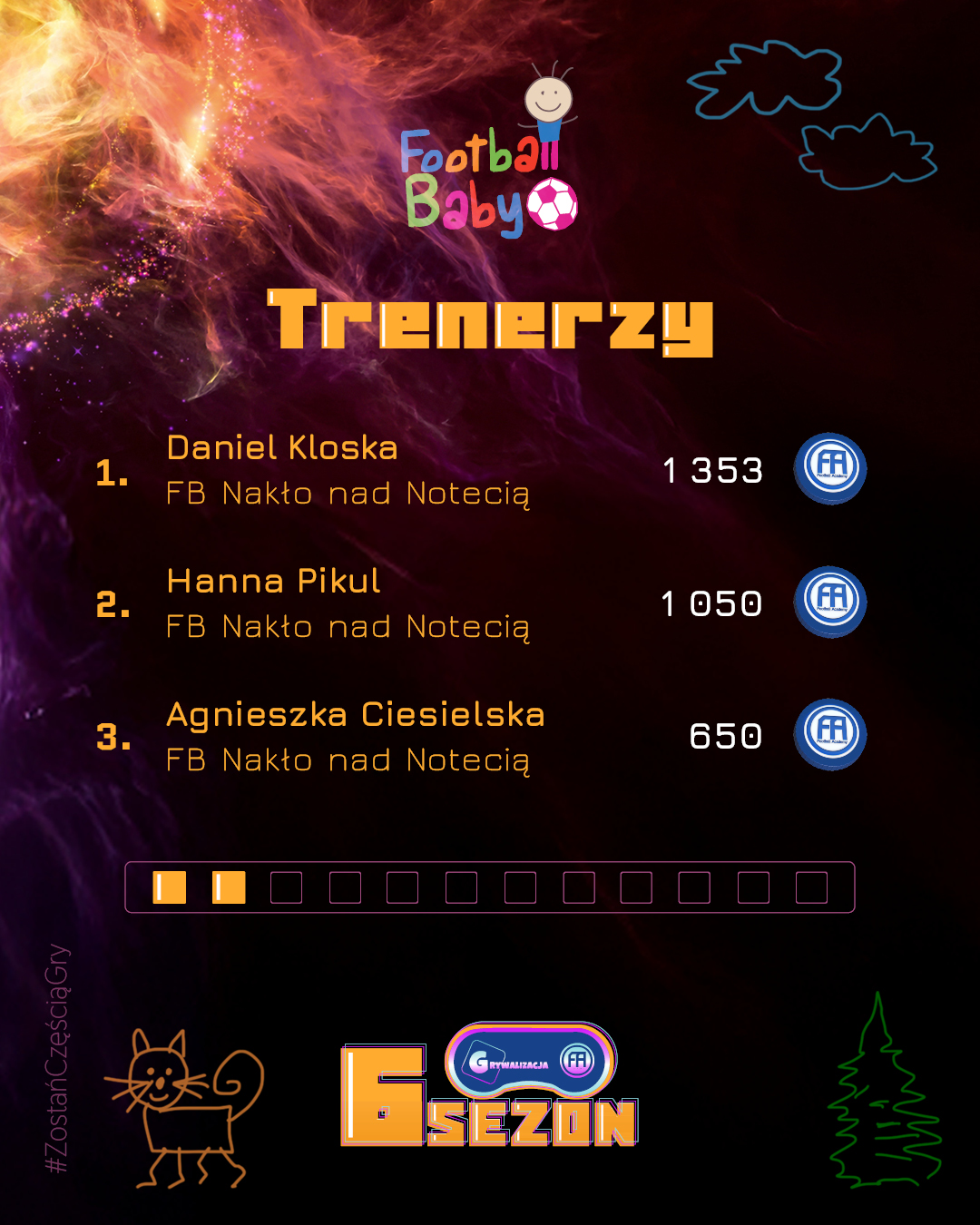Wygrywanie w Football Baby to coś więcej niż wynik – to radość, uśmiech i satysfakcja z każdego treningu. Każdy miesiąc przynosi nowych bohaterów, którzy trafiają do naszej „Hall of Fame” i pokazują, że systematyczność oraz entuzjazm mogą przerodzić się w piękną sportową przygodę. Gratulujemy wszystkim, którzy znaleźli się w TOP 3! Poniżej prezentujemy grafikę z najlepszymi zawodnikami, trenerami i oddziałami minionego miesiąca.