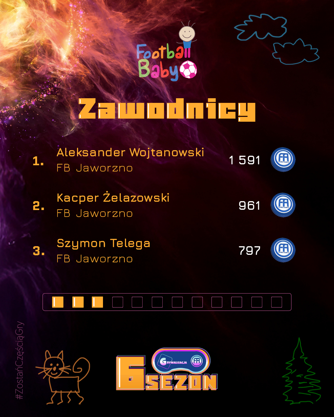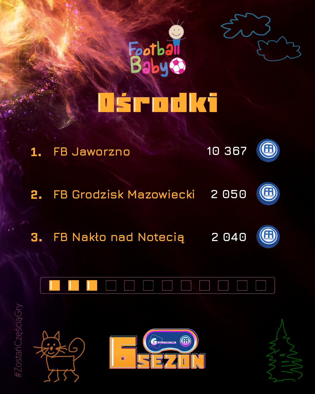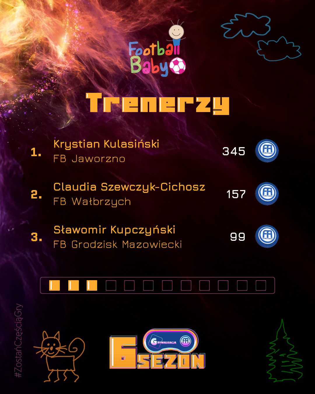 Wygrywanie w Football Baby to coś więcej niż wynik – to radość, uśmiech i satysfakcja z każdego treningu. Każdy miesiąc przynosi nowych bohaterów, którzy trafiają do naszej „Hall of Fame” i pokazują, że systematyczność oraz entuzjazm mogą przerodzić się w piękną sportową przygodę. Gratulujemy wszystkim, którzy znaleźli się w TOP 3! Poniżej prezentujemy grafikę z najlepszymi zawodnikami, trenerami i oddziałami minionego miesiąca.