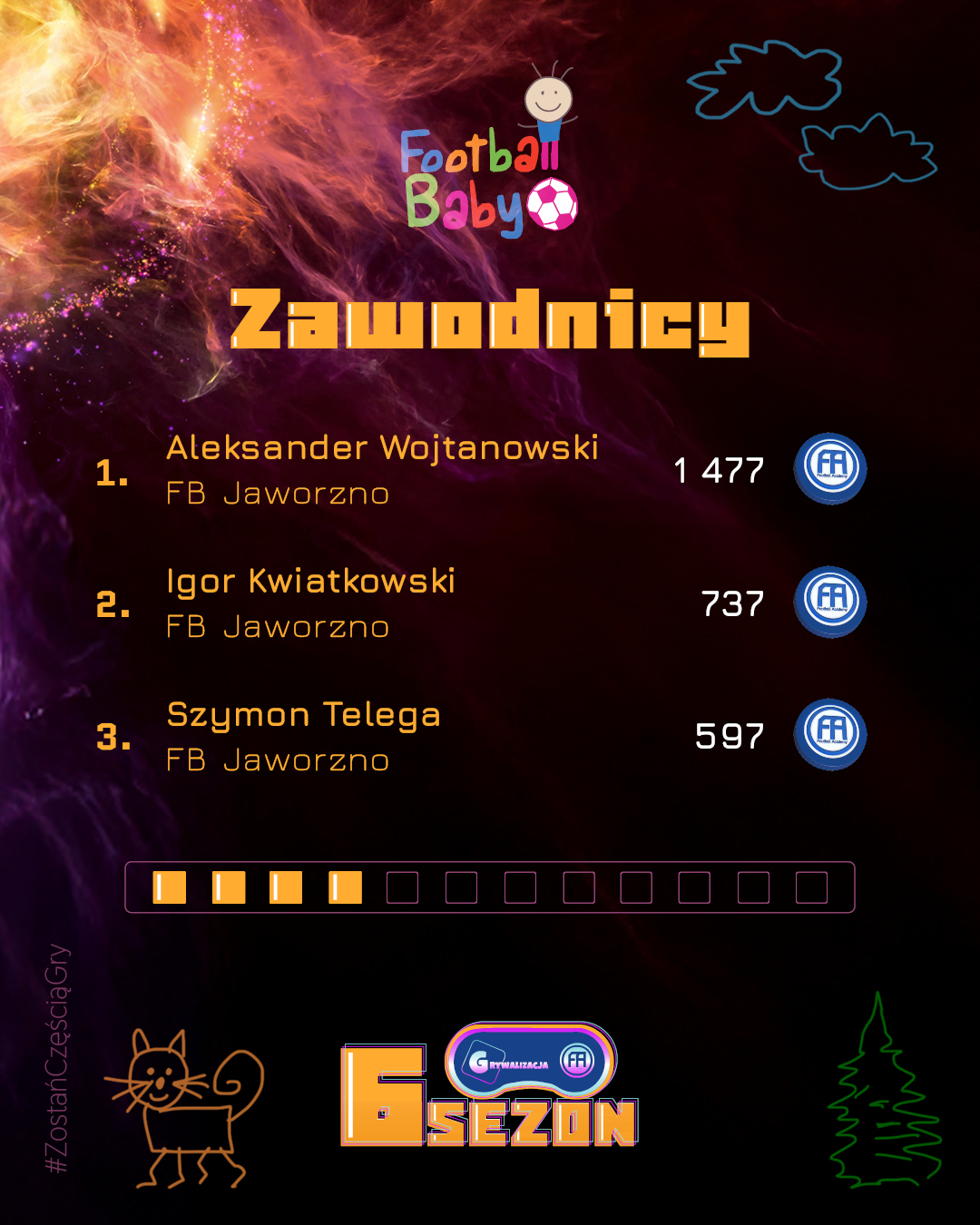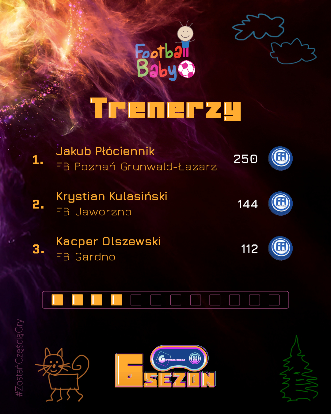 Wygrywanie w Football Baby to coś więcej niż wynik – to radość, uśmiech i satysfakcja z każdego treningu. Każdy miesiąc przynosi nowych bohaterów, którzy trafiają do naszej „Hall of Fame” i pokazują, że systematyczność oraz entuzjazm mogą przerodzić się w piękną sportową przygodę. Gratulujemy wszystkim, którzy znaleźli się w TOP 3! Poniżej prezentujemy grafikę z najlepszymi zawodnikami, trenerami i oddziałami minionego miesiąca.